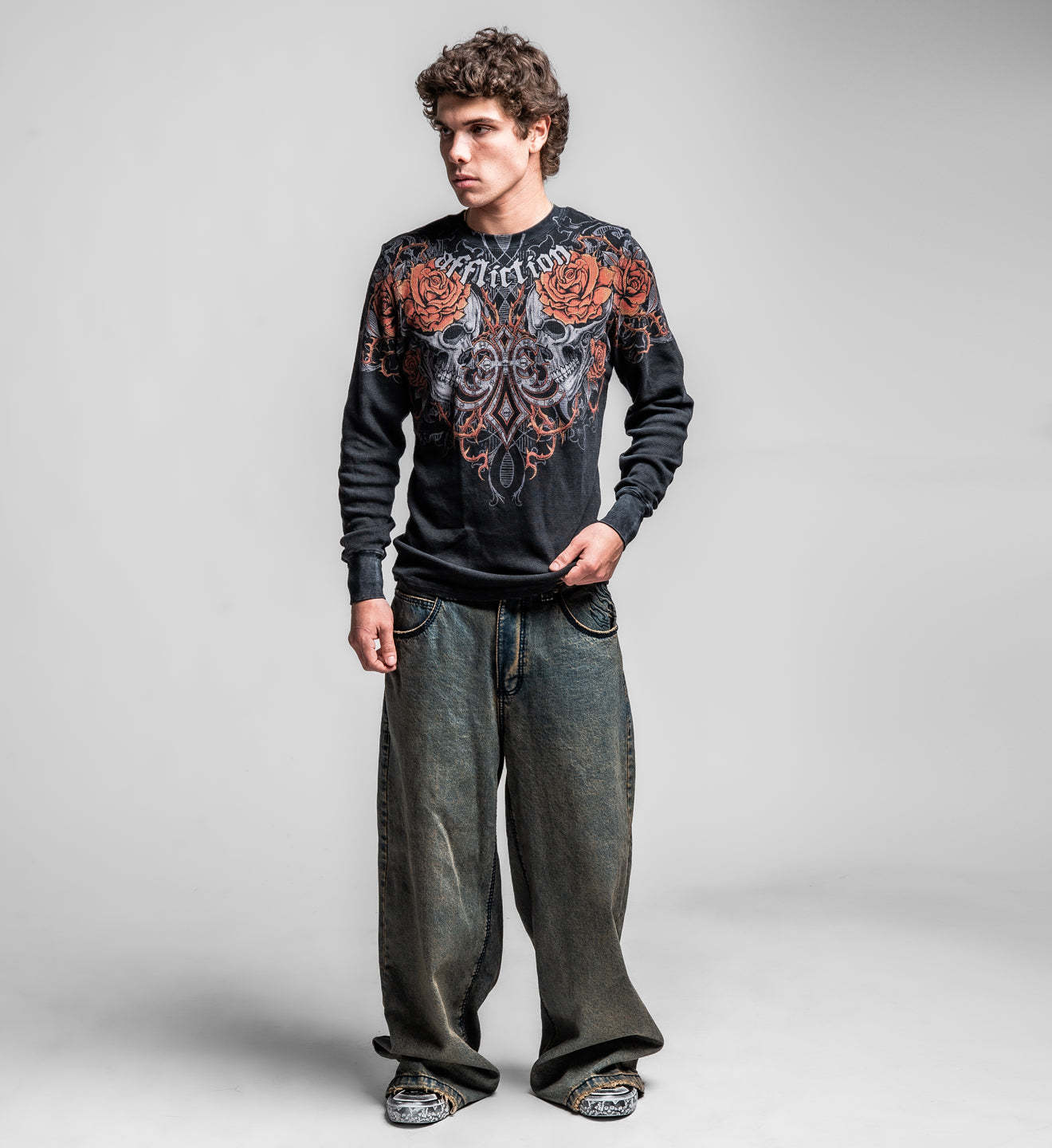 - Model is 5'11", 155lbs, and wearing a size Large