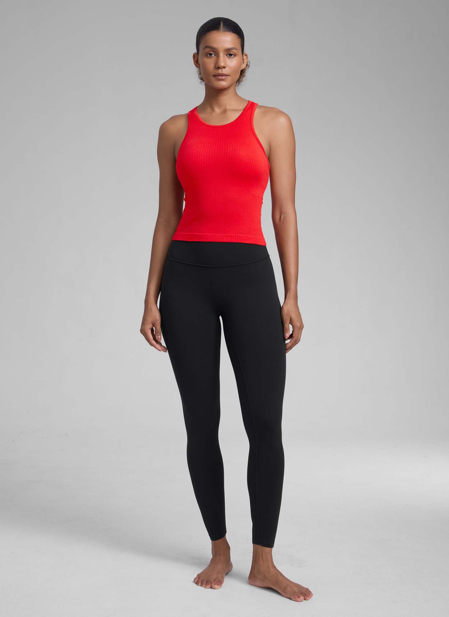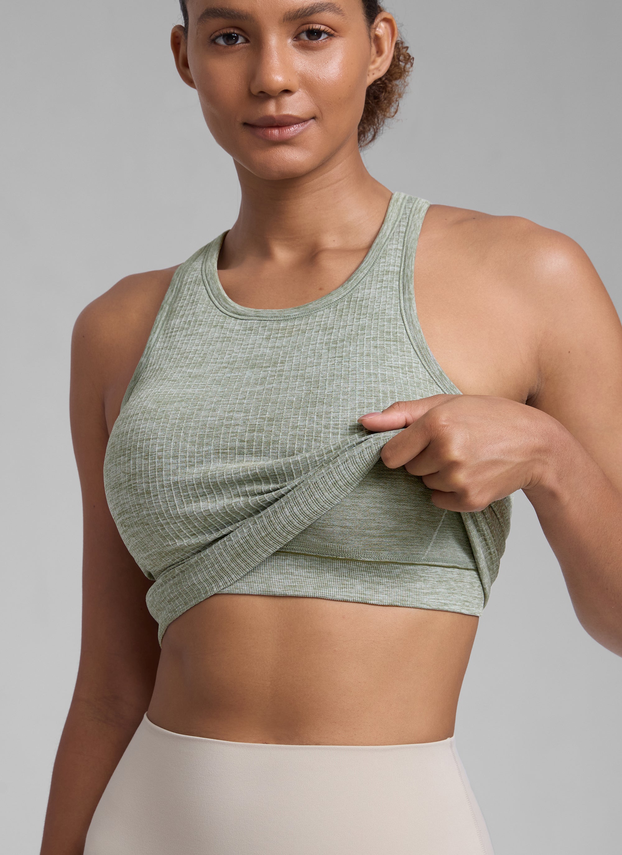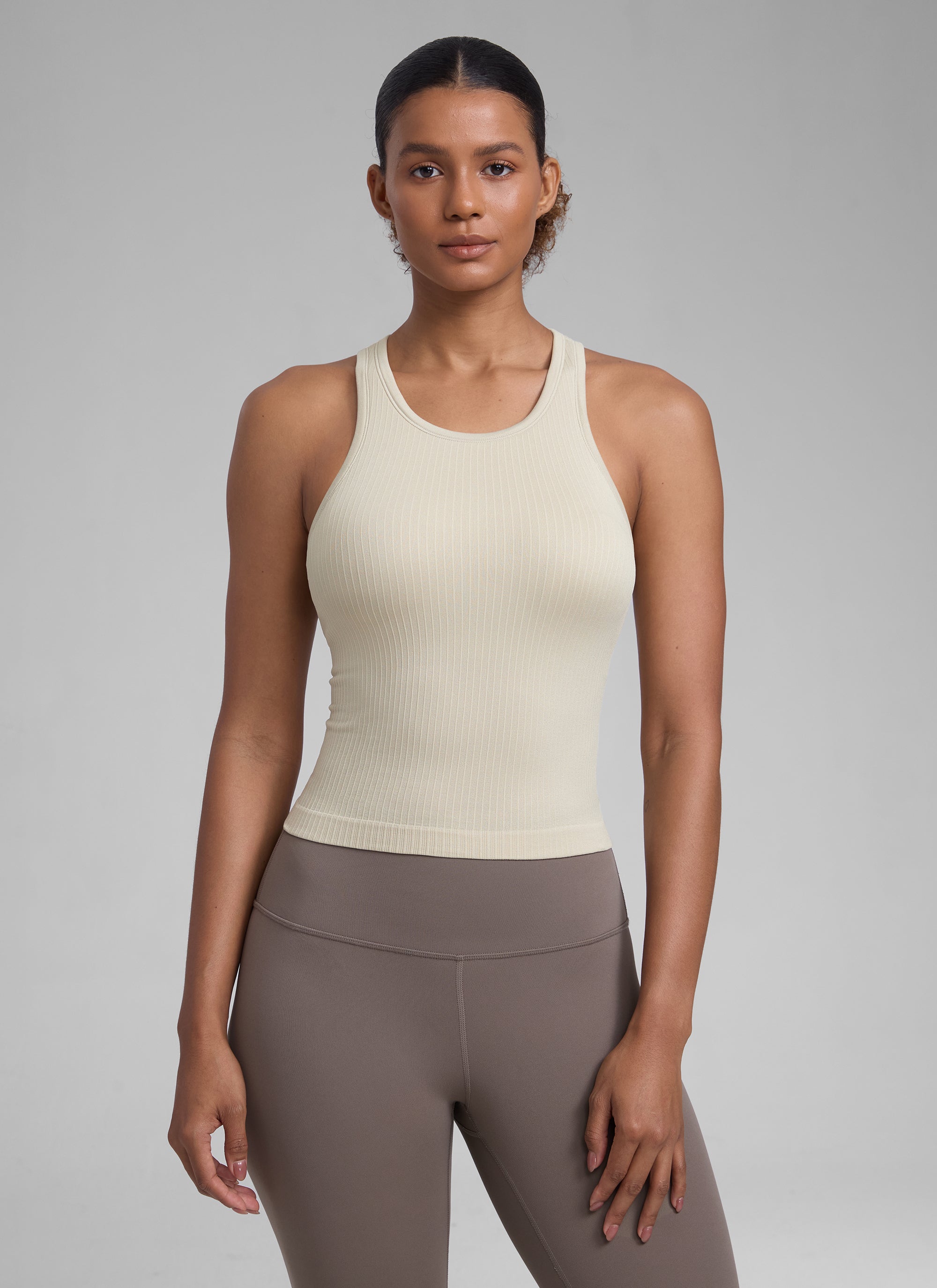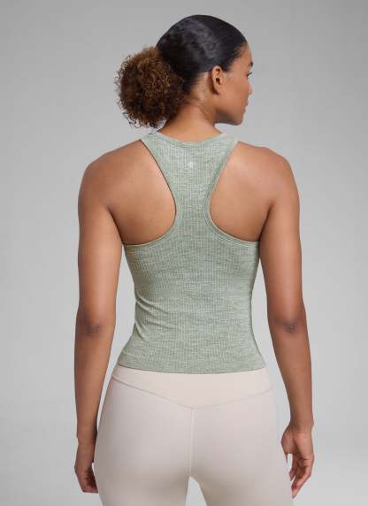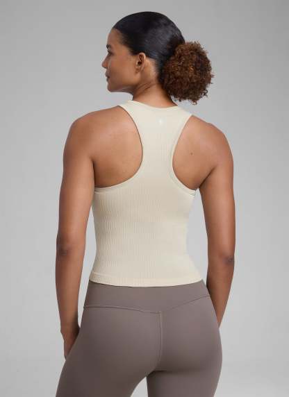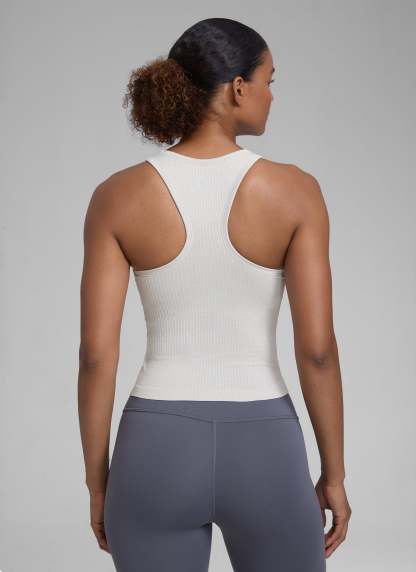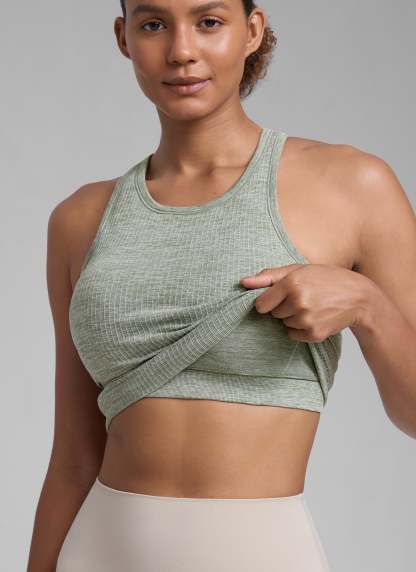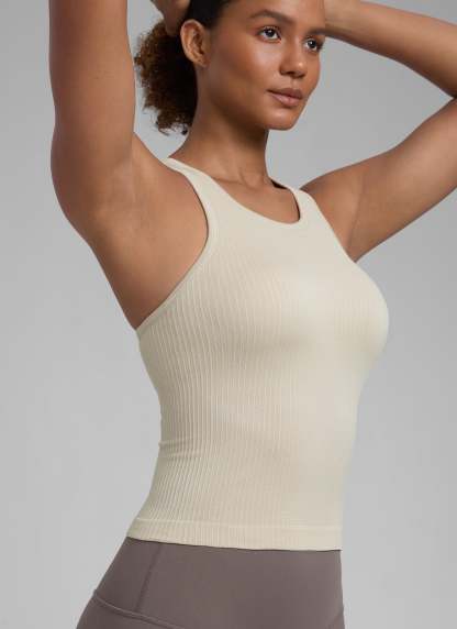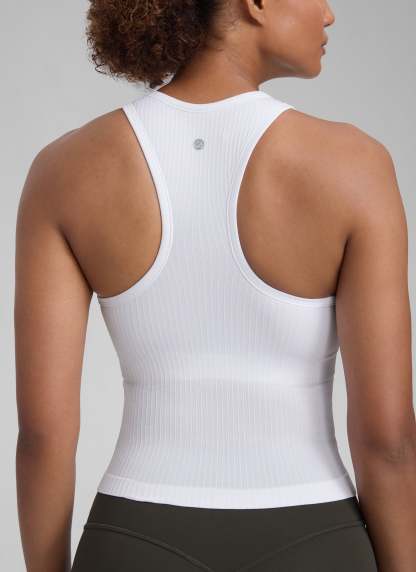 Seamless collection of smooth, breathable fabric is designed to help reduce chafing, encourage ventilation and wick away sweat to help you stay dry. High neck design provides more coverage. Racerback allows for air circulation and flexible stretching. Suitable for your exercise and leisure.