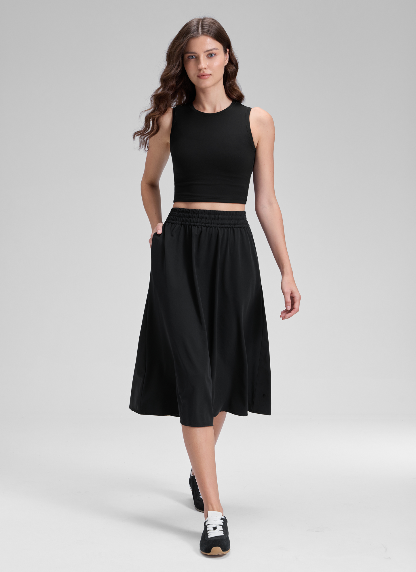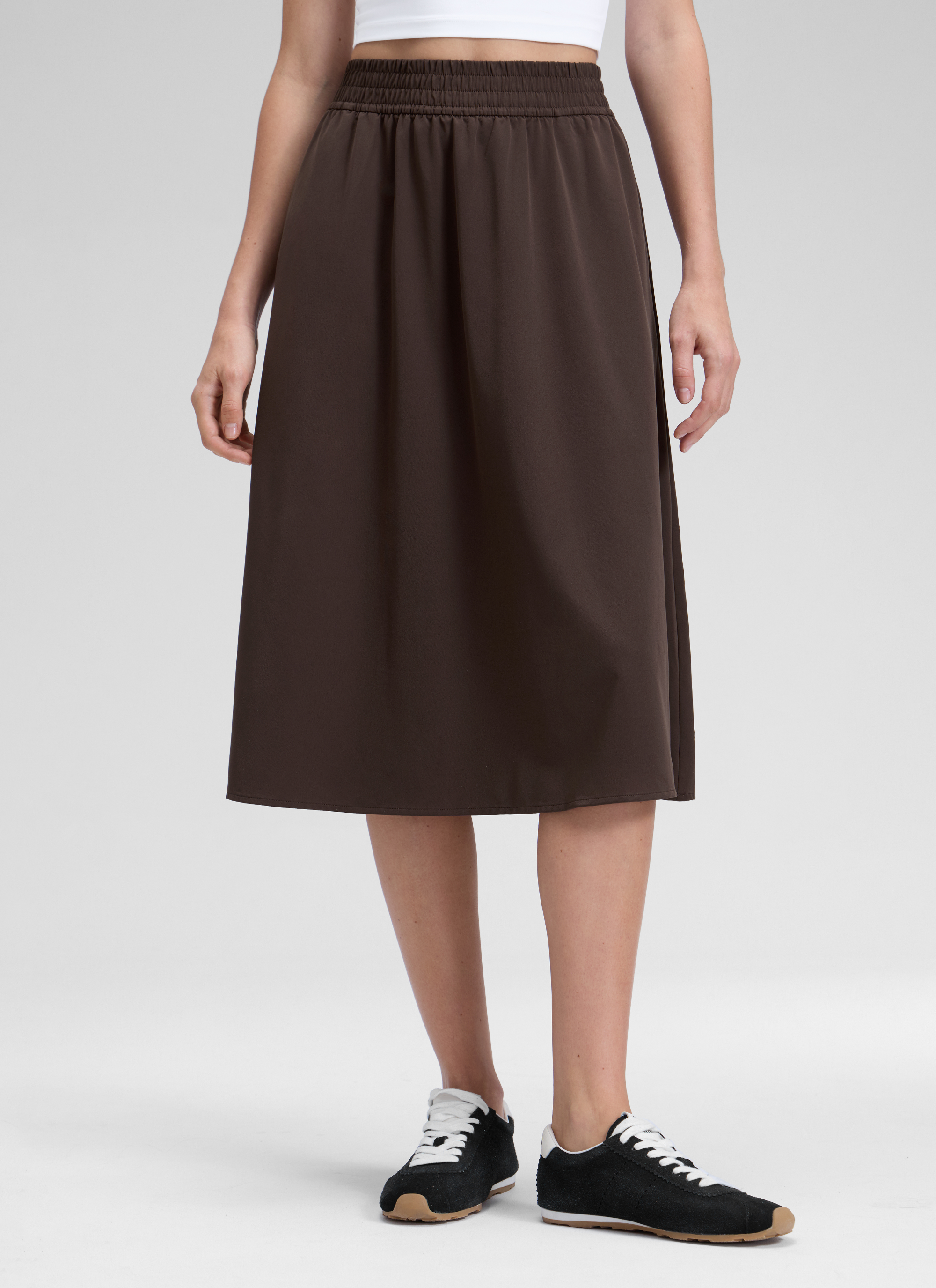 Crafted from breathable and weightless fabric, this below-knee skirt combines effortless elegance with a flared silhouette—perfect for elevating your style on any occasion.