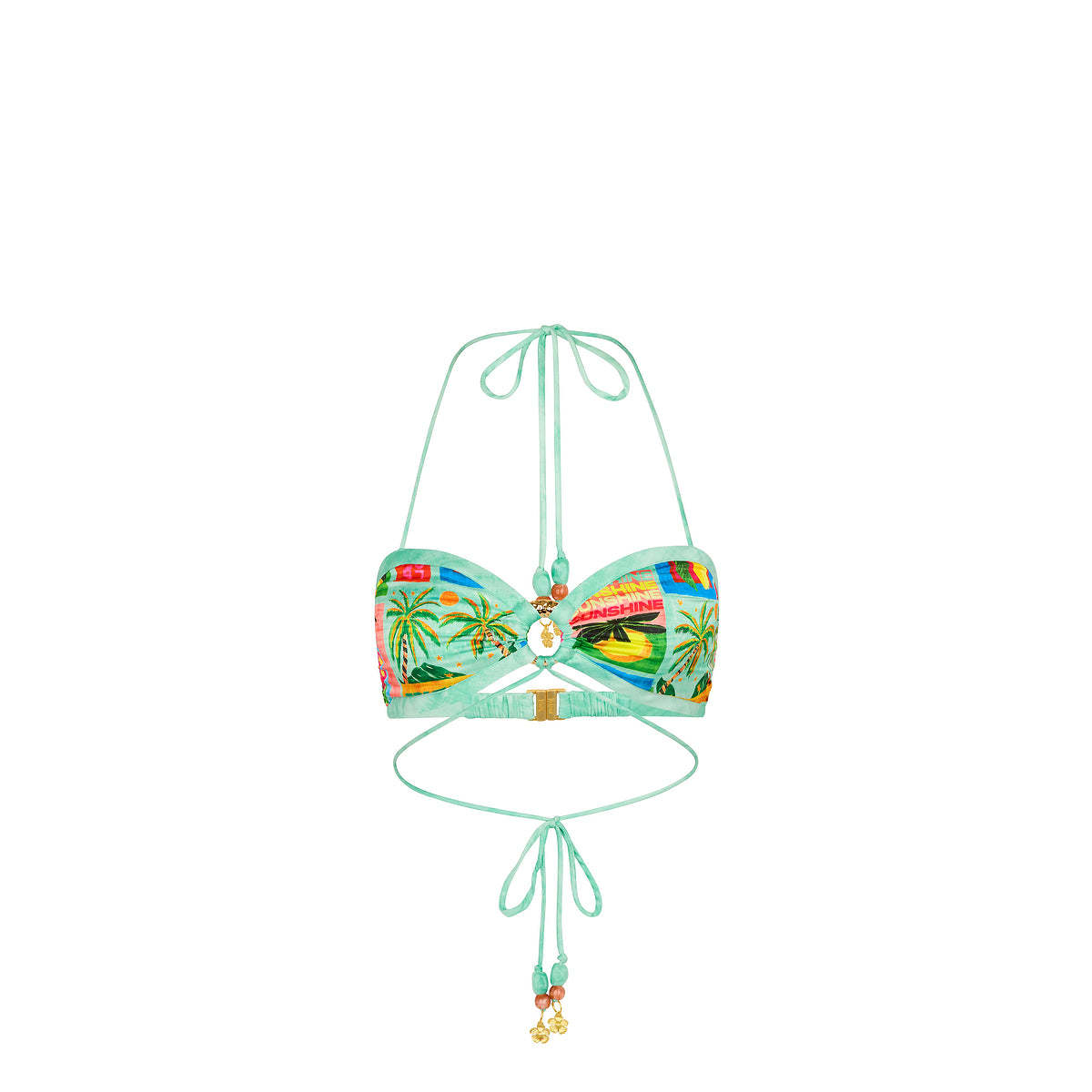 The Strappy Ring Tie Crop Top adds shine to any beach-to-bar look, featuring a bralette silhouette with a hammered centre-front ring, contrast binding, and delicate tie straps. Pairs perfectly with the Strappy Bias Maxi Skirt.